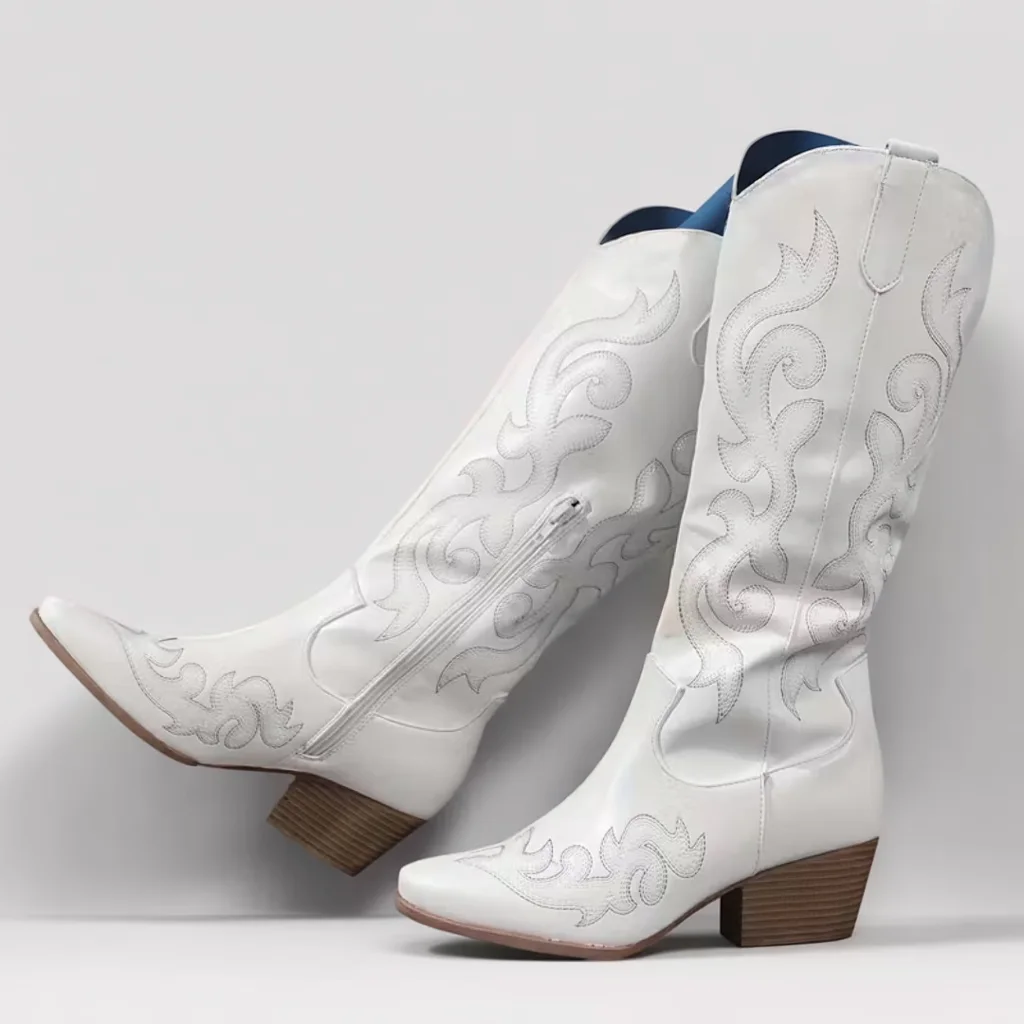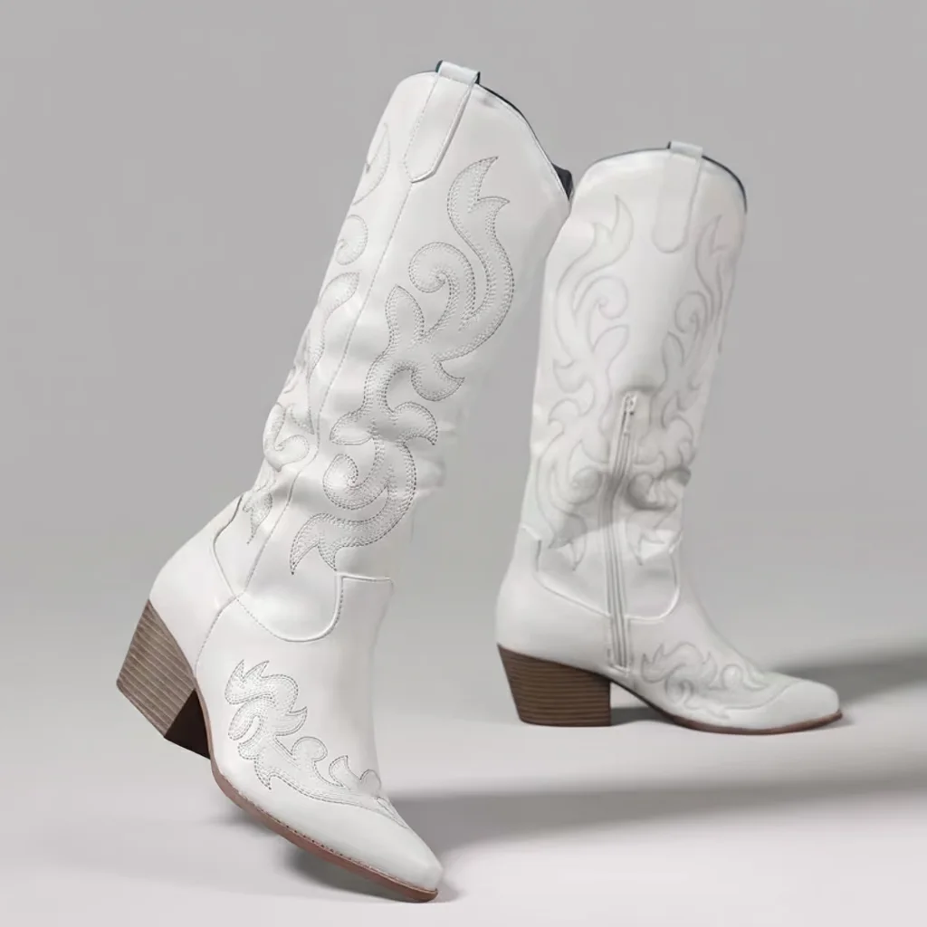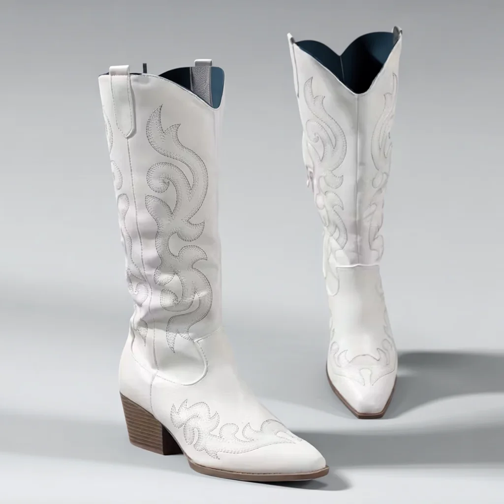 Women’s Mid-Heel Cowboy Boots, White Slip-On, Round Toe Casual Style
