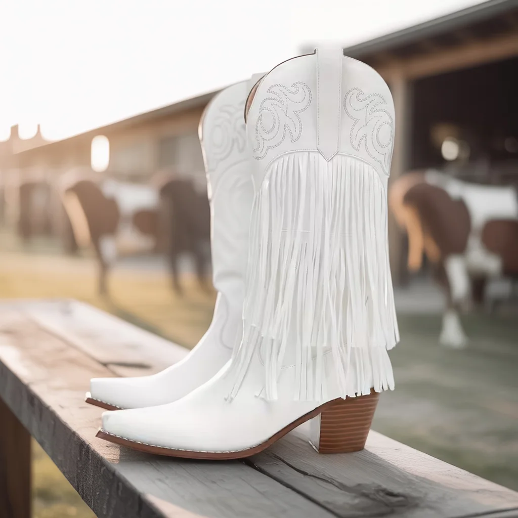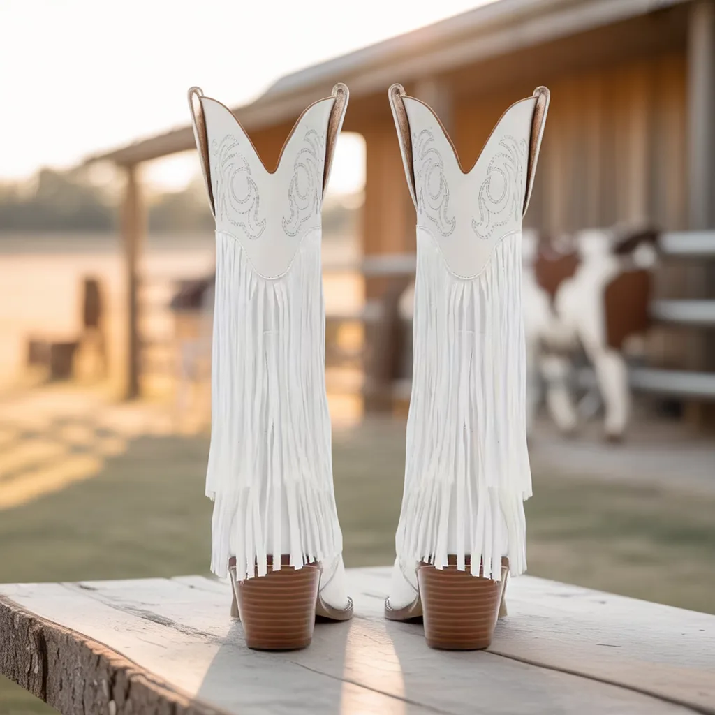 Women’s Vintage Western Fringe Boots, White Pointed Toe, Chunky Heel
